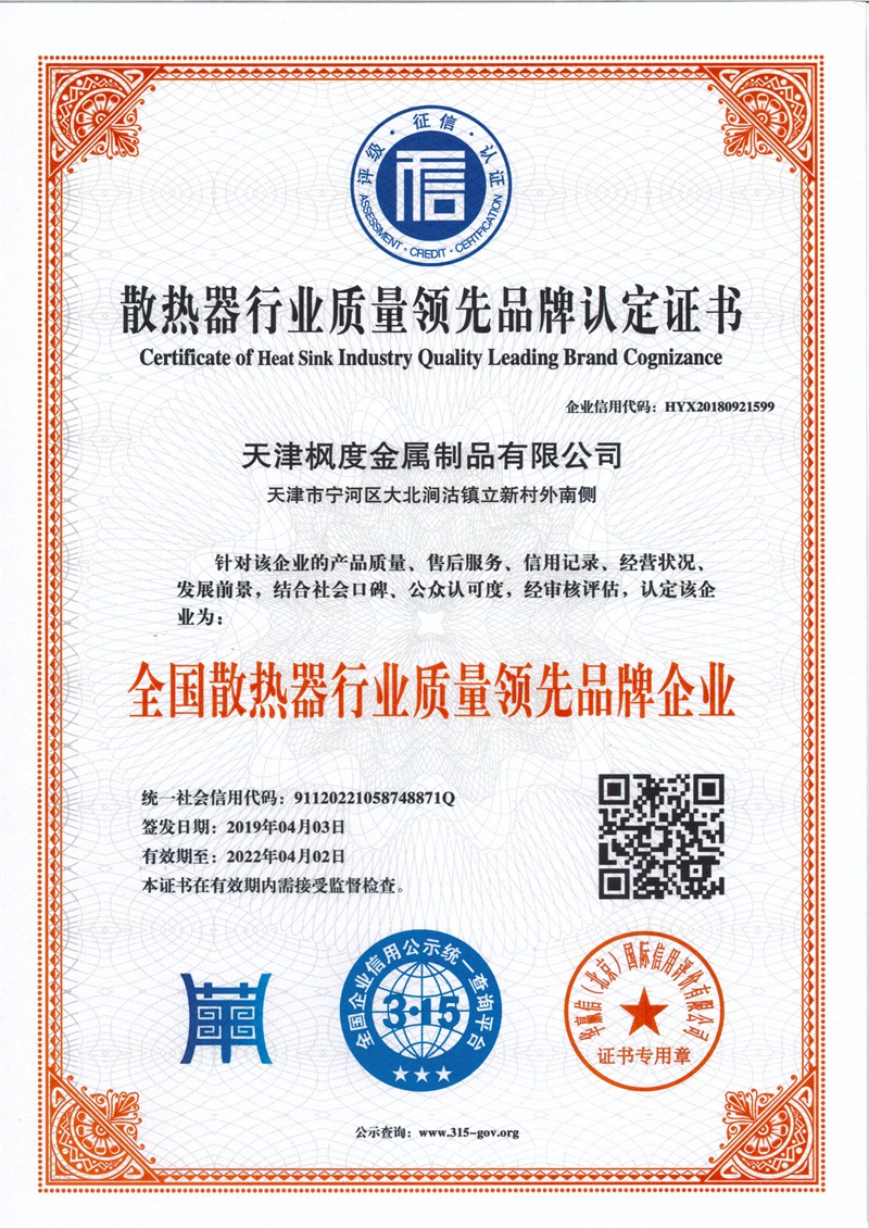 散熱器行業質量領先品牌認定證書